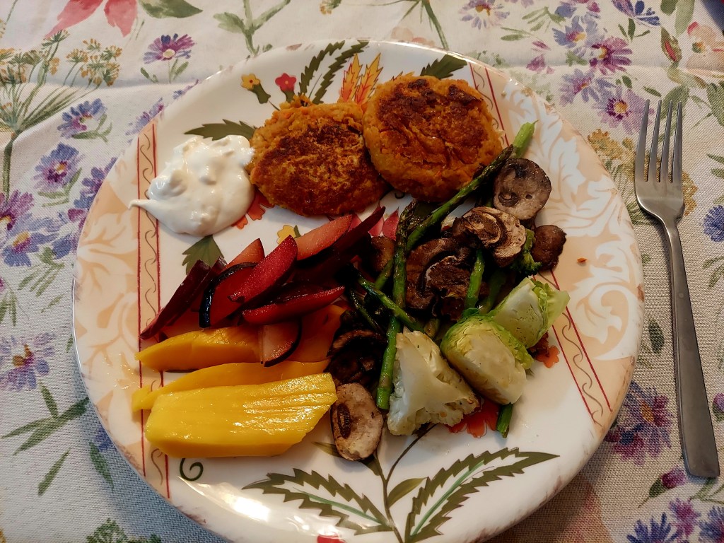 We’ve tried a few versions over the last month, including one good black bean version, but these chickpea veggie burgers were our favorite. My daughter made a Tzatziki-inspired sauce to drizzle over them, and we served them with a side of fresh mango and plums, as well as roasted Brussels sprouts, mushrooms, and asparagus. It was so delicious!