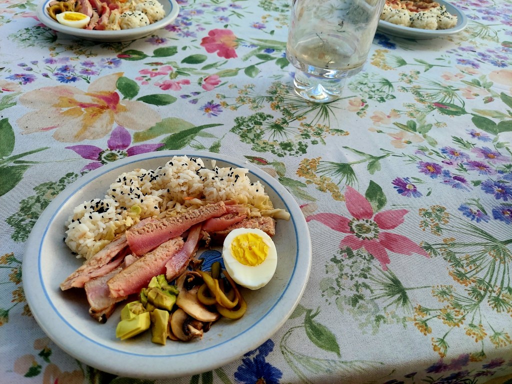 - Plate rice with sliced tuna, veggies, edamame, avocado, and hardboiled egg.